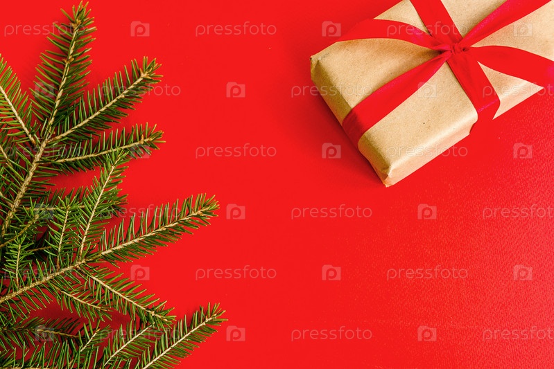 Подарок и елка на красном фоне