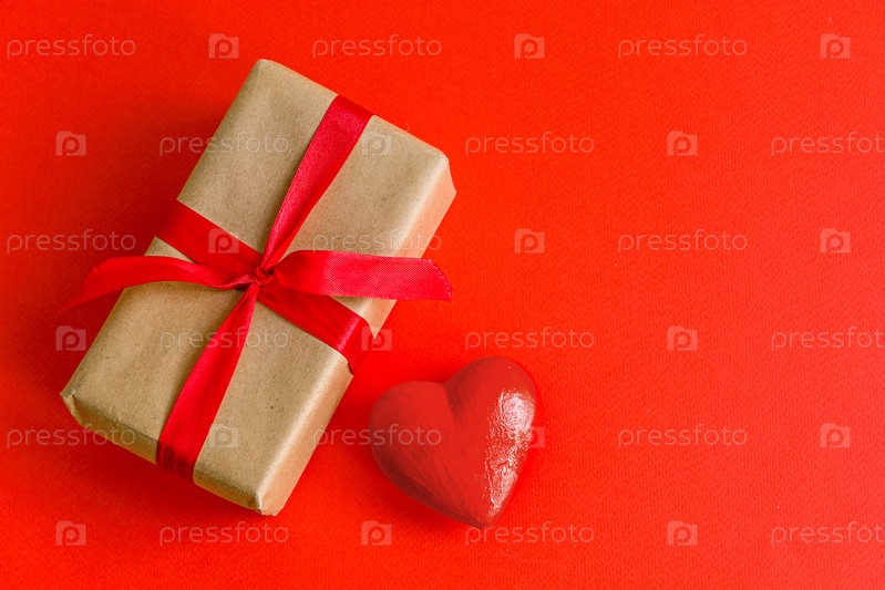 Подарок и сердце на красном фоне. День святого Валентина