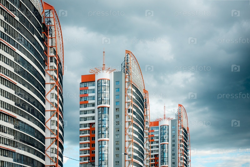 Многоэтажное современное здание на фоне голубого неба