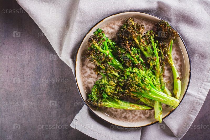 Крупный план жареных зеленых ростков брокколи на тарелке на столешнице