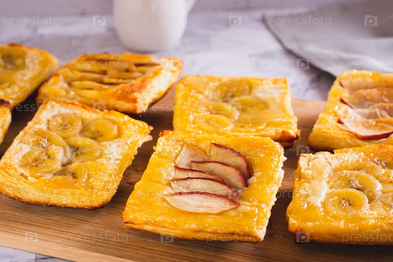 Маленькие перевернутые тарталетки из слоеного теста с яблоком и бананом на доске