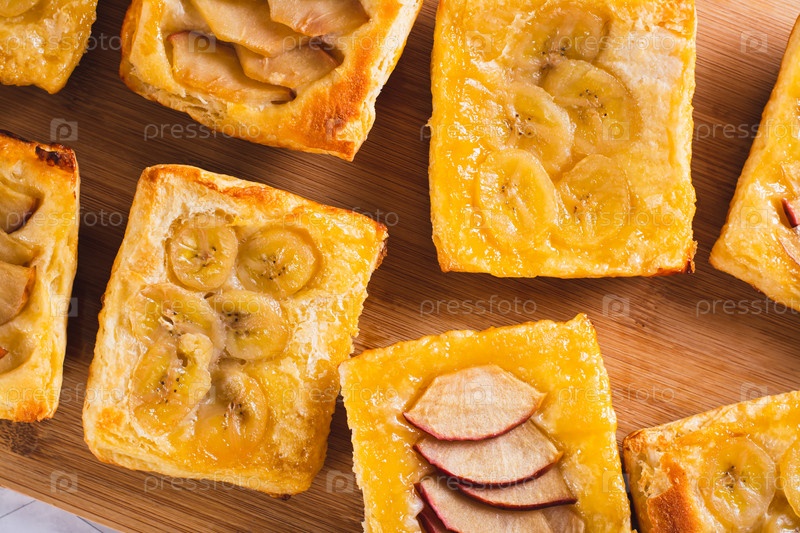 Крупный план перевернутых пирогов из слоеного теста с яблоком и бананом на доске, вид сверху
