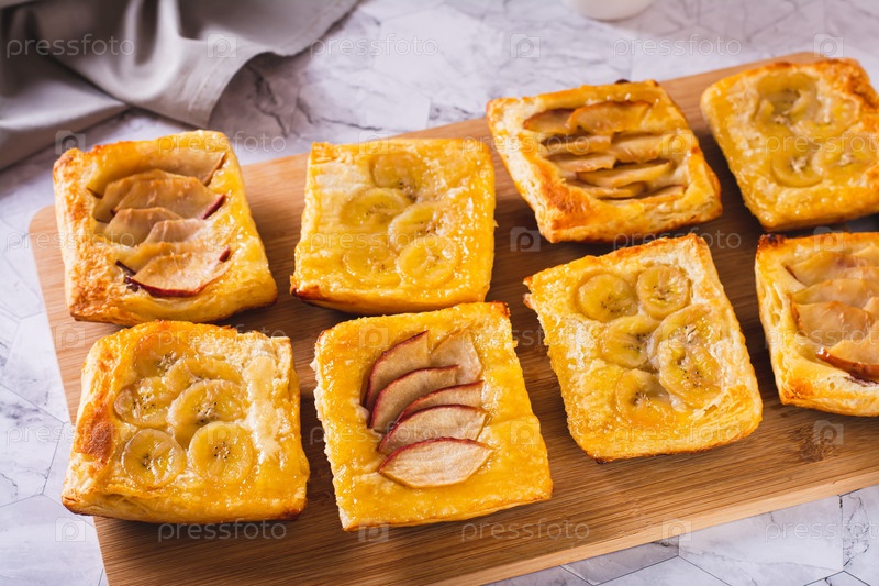 Небольшие перевернутые пирожные из слоеного теста с бананом и яблоком на доске