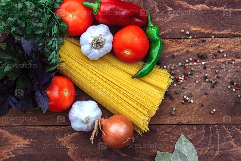 Куча спагетти с овощами, луком, чесноком, сладким перцем, перцем чили, помидорами с пучок петрушки и базилика, регана и разбросанных специй и лавровый лист вид сверху