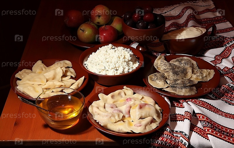 Вареники с разной начинкой на деревянном фоне