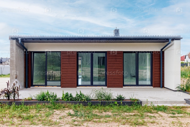 Вид небольшого современного дома сразу после постройки. Ступенчатая система строительства дома