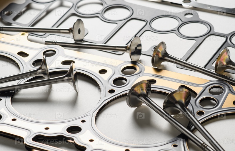 Концепция авторемонта. Клапан двигателя и прокладка на белом фоне. Селективный фокус на клапане