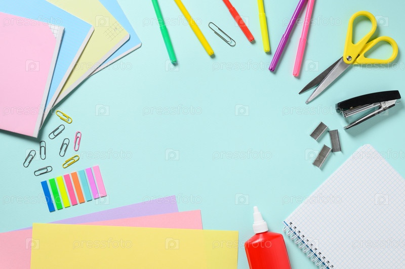 Канцелярские товары на синем фоне. Плоская планировка, пространство для копирования