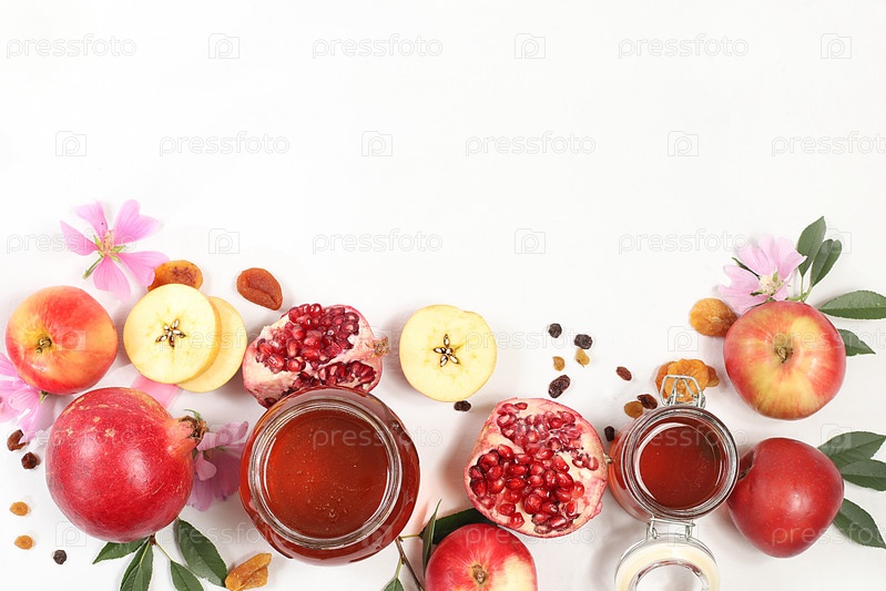 Концепция еврейского праздника Рош ха-Шана с яблоками, медом, гранатом и курагой на ярко-белом фоне, вид сверху с местом для текста, еврейский новый год и день благодарения