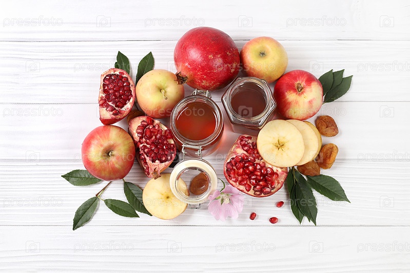 Осенний баннер с медом, яблоками, гранатами, цветами, сухофруктами на светлом фоне с местом для текста, композиция для еврейского праздника Рош ха-Шан, привет осень и концепция дня благодарения, избирательный фокус