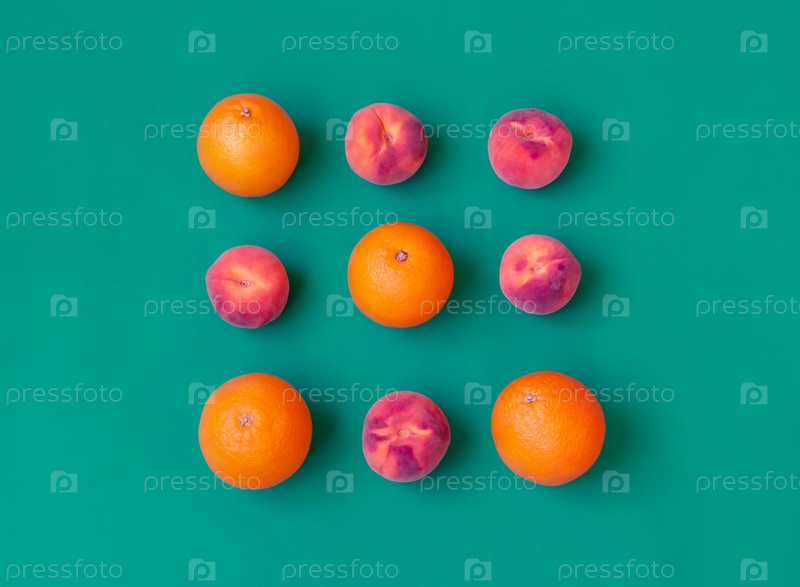 Узор с персиками и апельсинами. Абстрактный фон. Фрукты на зеленом фоне