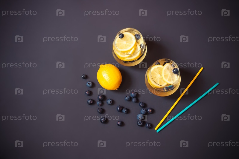 Стаканы летнего лимонада с черникой и лимоном, черника, лимон и соломинки рядом. Темный фон