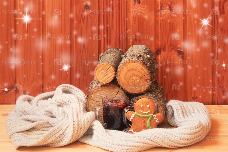 Рождественская композиция. Бокалы глинтвейна, пряничный человечек, шарф и куча дров