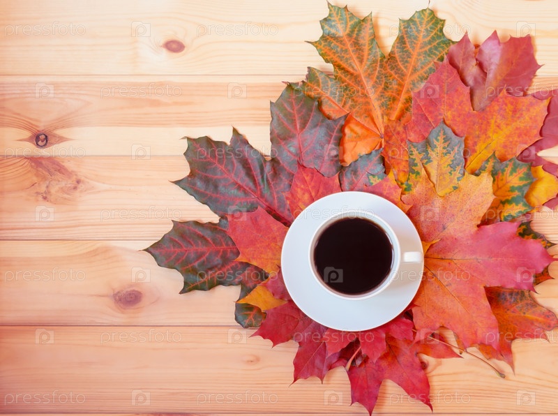 Осенние кленовые листья и чашка кофе. Концепция расслабления. Вид сверху, пространство для копирования