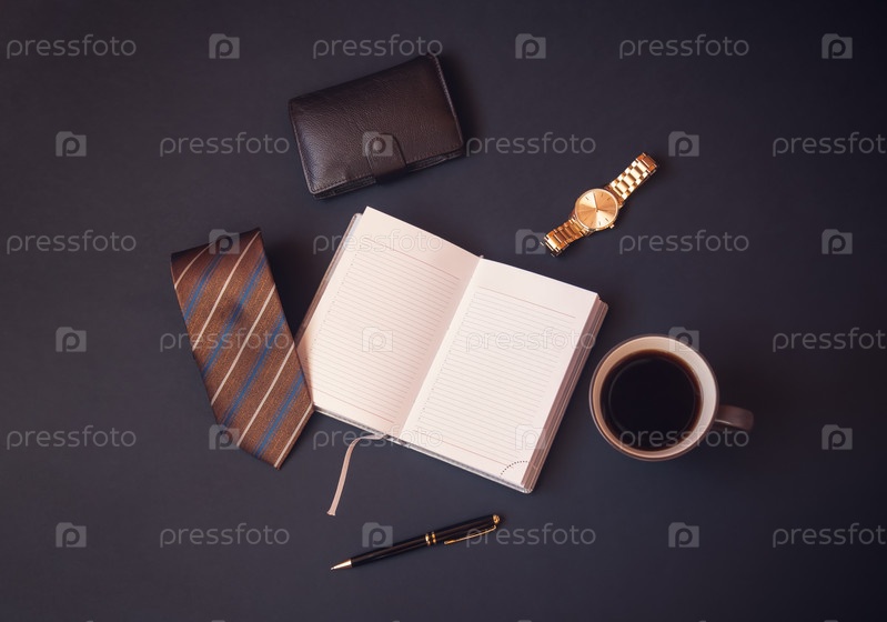 Открытый дневник, галстук, кружка кофе, бумажник, часы и ручка на темном фоне. Вид сверху, пространство для копирования