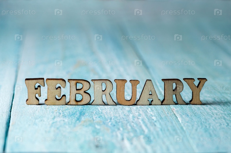 Февраль — это слово на синем фоне. Февраль - деревянные буквы. Месяцы календаря