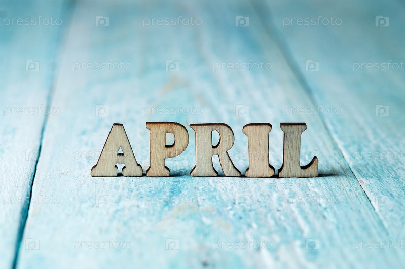 Апрель — это слово на синем фоне. Апрель - деревянные буквы. Месяцы календаря