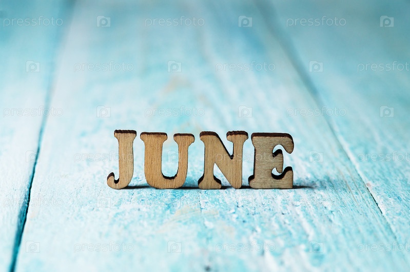 Июнь — слово на синем фоне. Месяцы календаря. Июнь - деревянные буквы