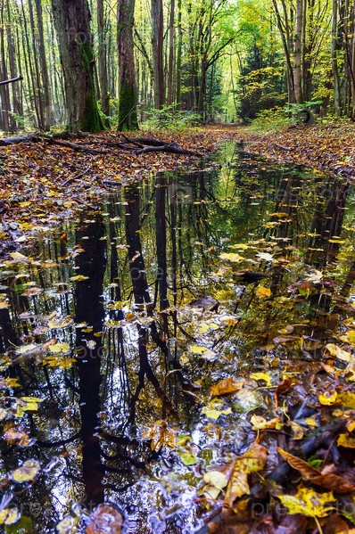 Осенний лес. Желтые и красные листья на деревьях осенью. Лесная дорога