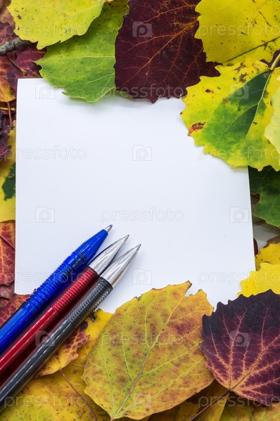 Ручки и блокнот на осеннем фоне. Осенние листья и блокнот для заметок