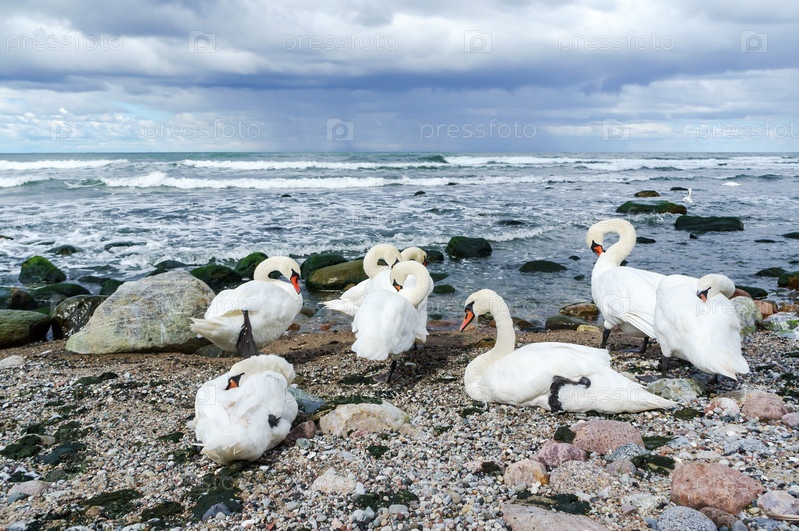 Лебеди на море. Каменистый берег. Лебеди на скалистом берегу