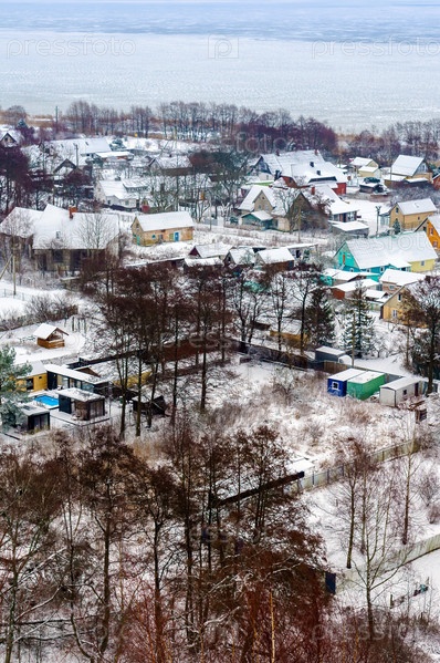 Природный парк-заповедник. Прибрежный поселок, одноэтажные дома. Вид сверху
