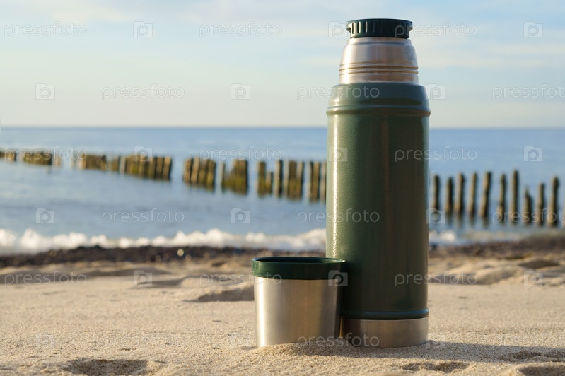 Термос с чаем на фоне природы. Пить чай на берегу моря