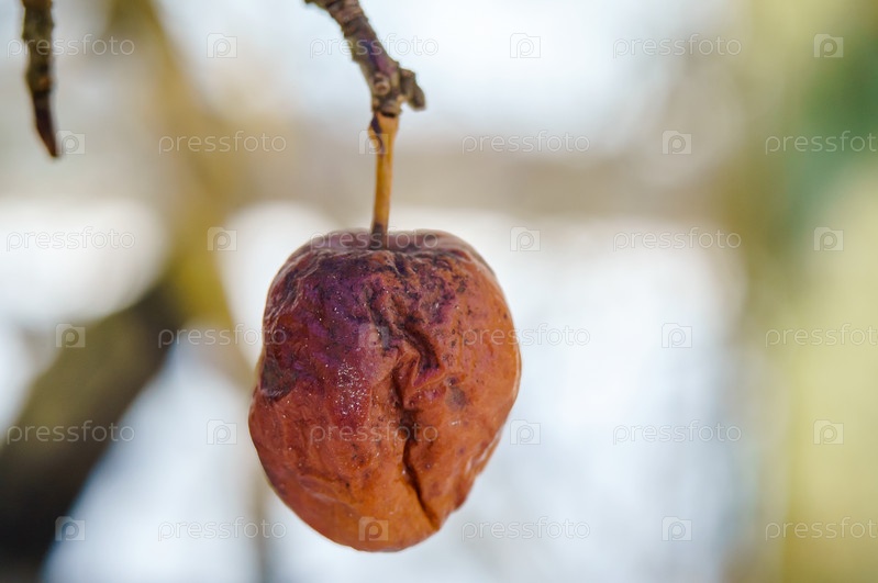 Яблоко на дереве. Яблоко морщинистое. Увядшее увядшее яблоко