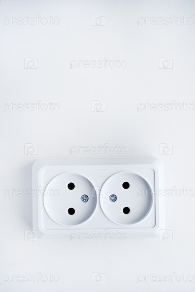 Белая двойная электрическая розетка на белом фоне. Еврозетта крупным планом. Электроприбор