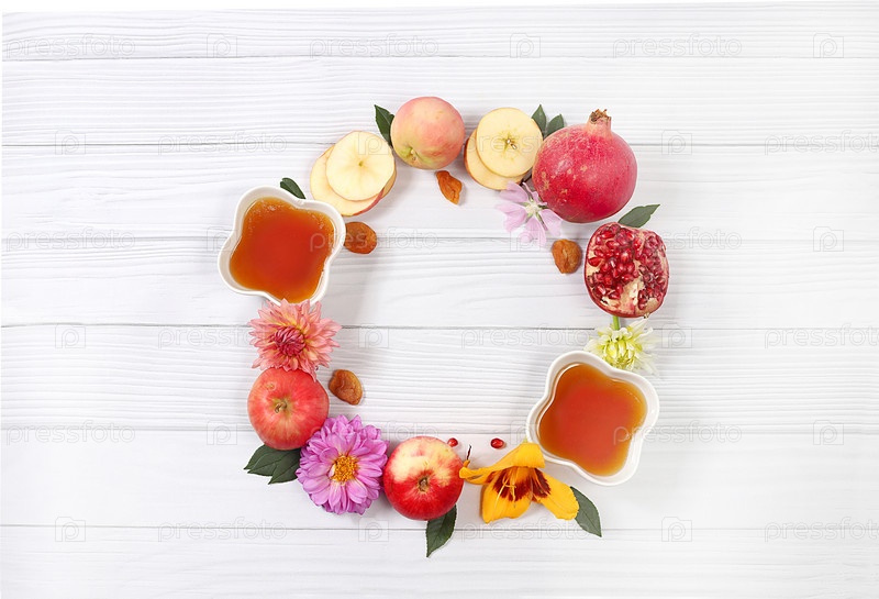 Осенний баннер с медом, яблоками, гранатами, цветами, сухофруктами на светлом фоне с местом для текста, композиция для еврейского праздника Рош ха-Шана, привет осень и концепция дня благодарения, выборочный фокус, с копировальным пространством
