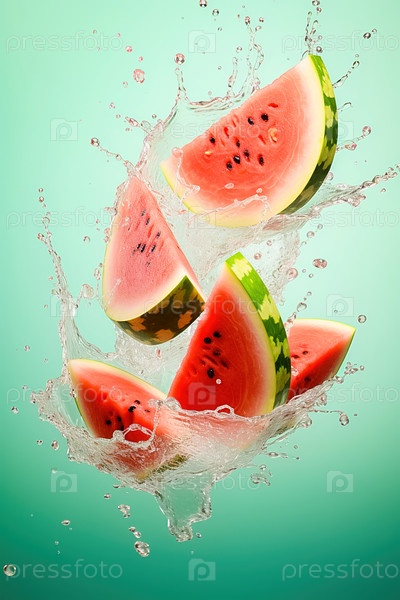 Нарезанные кусочки сочного арбуза с брызгами воды. Левитация