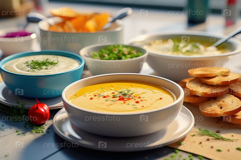 Различные виды супа в ресторане. Ассорти супов
