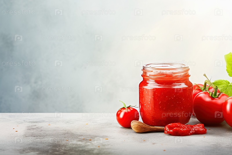 Томатная паста с чесноком и перцем, аджика на светлом фоне. Фото высокого качества