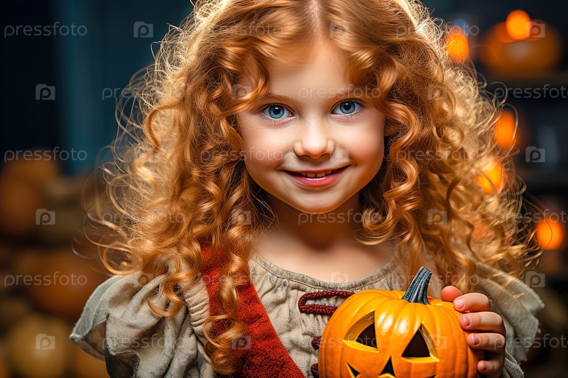 Портрет счастливой рыжеволосой девушки с тыквой. Концепция праздника Хэллоуин. Фото высокого качества