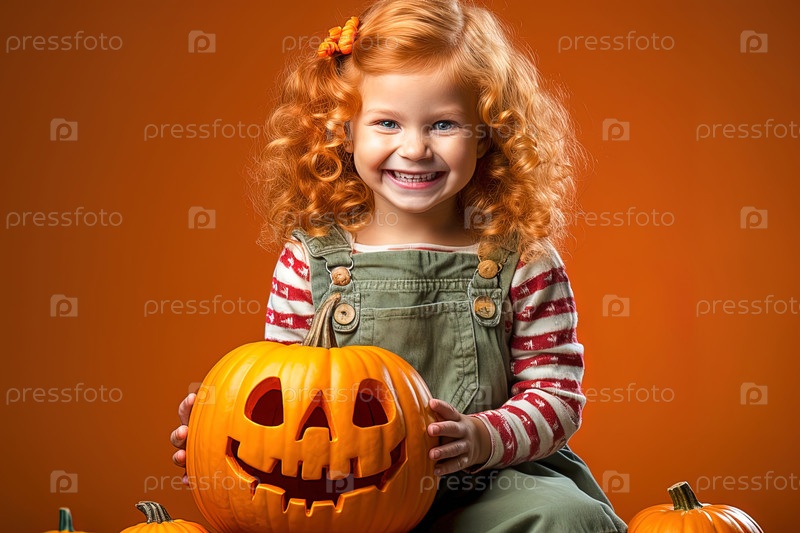 Портрет счастливой рыжеволосой девушки с тыквой. Концепция праздника Хэллоуин. Фото высокого качества