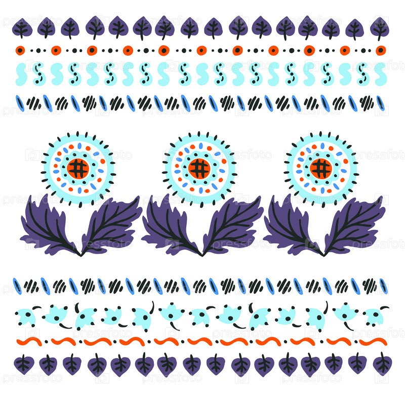 Набор этнических элементов. Бордюр представляет собой полосу с цветами, листьями, ветками, вензелями. Народная вышивка. Славянский, украинский, русский мотив. Хохлома, матрешка, дымковская игрушка. Мексиканский, индийский, цыганский ковер. Вязаное кружево