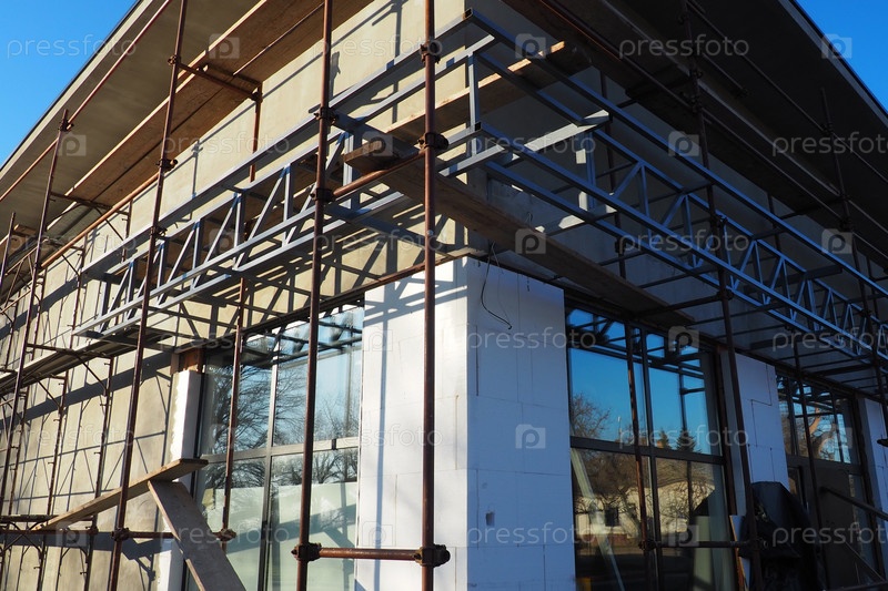 Леса на новый одноэтажный дом. Фасадные работы. Строительный бизнес. Малоэтажное частное здание. Оштукатуривание стены здания. Здание магазина. Металлические производственные конструкции