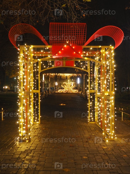 Арка с бантом. Красивые гирлянды украшают центр города. Уличные украшения к Новому году и Рождеству. Светящиеся многочисленные желтые и белые лампочки в темноте. Сремска Митровица Сербия