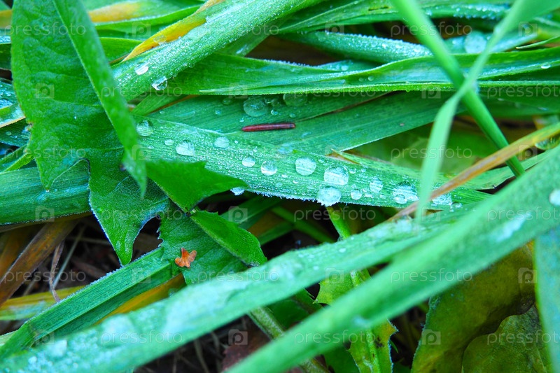 Роса или талая вода на зеленой траве. Оттаивание после утреннего зимнего мороза. Лежащая трава на лугу. Несезонная, безветренная безветренная погода. Зеленый лист с каплями воды