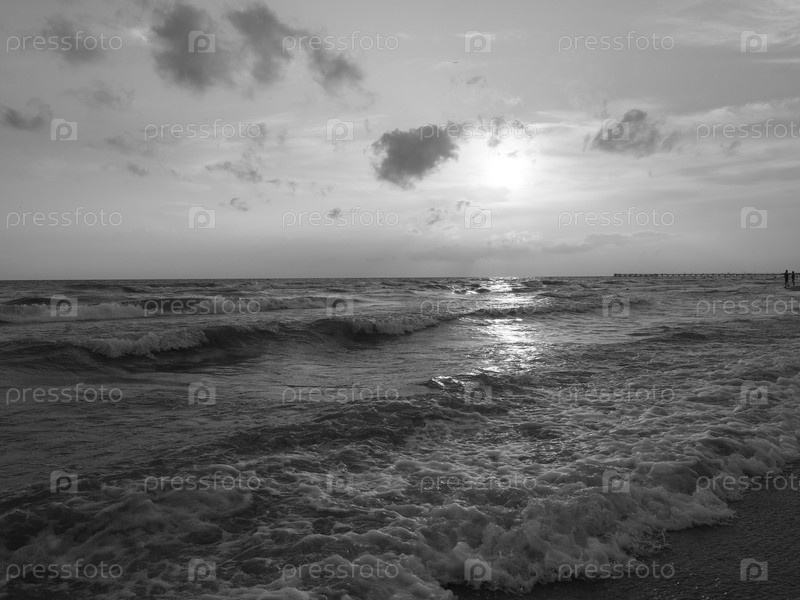 Закат над морем. Красивые волны на закате. Туристическая мекка, курорт. Вечернее небо. Лучи отражаются от воды