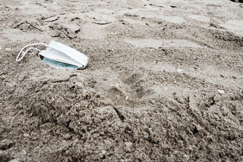 Использованную медицинскую маску оставили на песчаном пляже. Помятый синий щиток на песке. Пандемия коронавируса ковид-19. Экология, переработка и загрязнение окружающей среды одноразовыми изделиями
