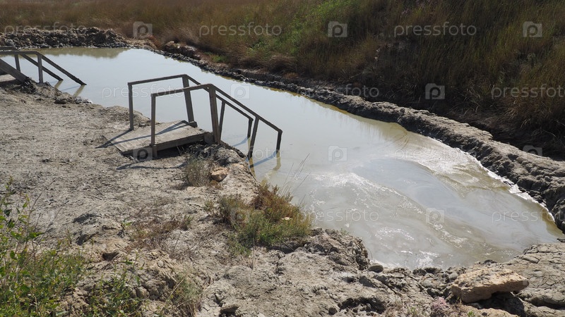 Кратер с серой вулканической лечебной глиной. Дыра с выдающейся аморфной массой из недр земли. Грязевое и газовое извержение. Темрюк. Поверхность почвы с трещинами. Текстура селевых трещин