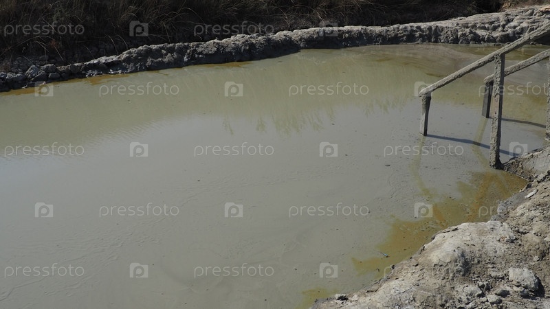 Кратер с серой вулканической лечебной глиной. Дыра с выдающейся аморфной массой из недр земли. Грязевое и газовое извержение. Темрюк. Поверхность почвы с трещинами. Текстура селевых трещин