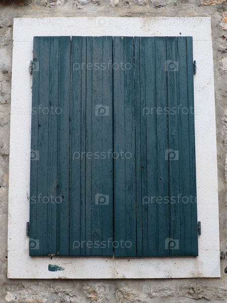 Старое окно с зелено-голубыми закрытыми ставнями на старом доме. Винтажная текстура. Герцег-Нови Черногория, старый каменный дом. Архитектура Адриатического региона. Крепление окон и ставней к стене