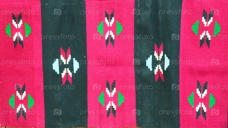 Килим ручной вязки. Сербский традиционный национальный народный узор на ковре. Красные, розовые и черные вертикальные полосы. Ромбические декоративные разноцветные вышитые элементы. Культурное наследие