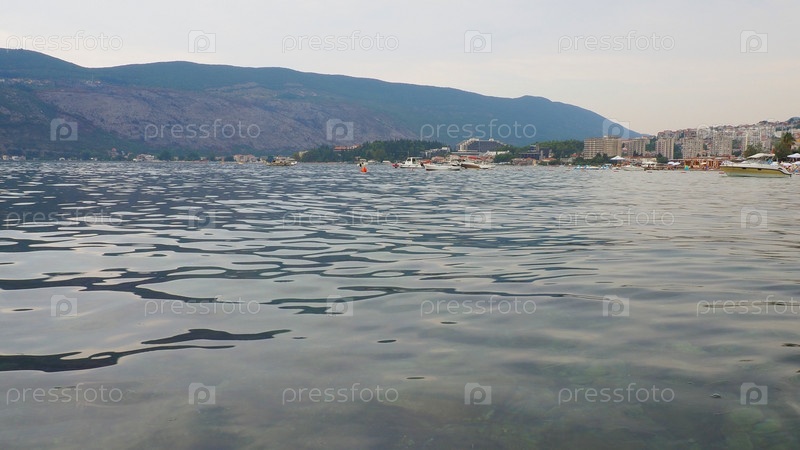 Герцег-Нови, Черногория. Морской отдых. Морские прогулки. Лодки плывут по Адриатическому морю. Средиземноморский туристический бизнес. Мелкая рябь на соленой воде. Гостиницы и городские многоэтажки Герцег-Нови и Игало
