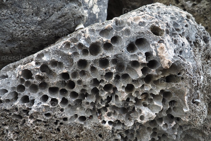 Вулканические камни. Губчатый ячеистый рыхлый воздушно-пористый каменный материал. Скала крупным планом возле Мельина, Герцег-Нови, Черногория. Отверстия в застывшей лаве. Серо-черная скала Адриатического средиземноморского региона