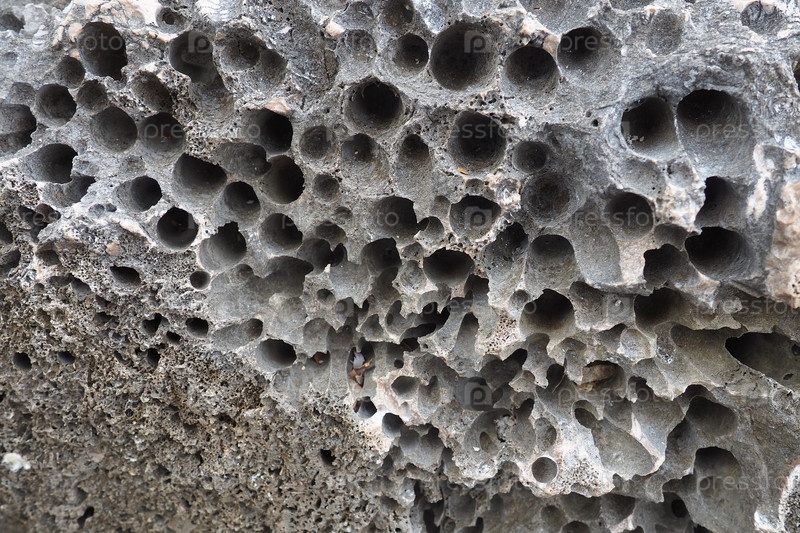 Вулканические камни. Губчатый ячеистый рыхлый воздушно-пористый каменный материал. Скала крупным планом возле Мельина, Герцег-Нови, Черногория. Отверстия в застывшей лаве. Серо-черная скала Адриатического средиземноморского региона
