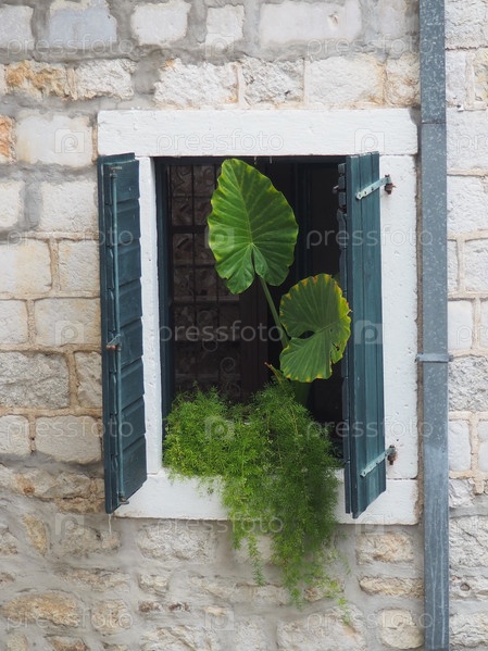 Листья монстеры на окне, вид с улицы. Герцег-Нови, Черногория. Ставни и каменная старая стена. Адриатическая средиземноморская архитектура. Тропические растения, лианы, род Ароидные семейства Ароидные