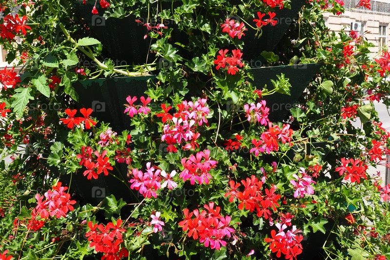 Цветущая красная герань плющелистная пеларгония в вертикальном дизайне озеленения улиц и парков. Красивые большие цветы пеларгонии герани зеленые листья. Цветоводство и садоводство